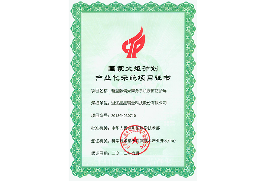 11.2.1-27國家火炬計劃產業化示范項目證書(新型防偏光商務手機視窗防護屏)2013年9月