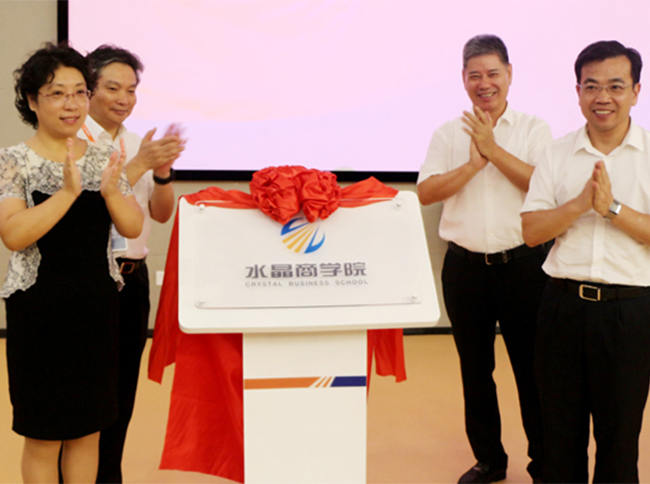 臺州市政府副市長蔣冰風、椒江區委副書記區長楊玲玲、星星集團董事長兼總裁葉仙玉、水晶光電董事長林敏共同為水晶商學院揭牌。