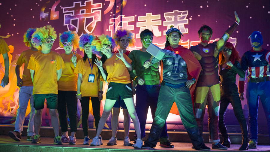 在一曲《葫蘆娃》的音樂(lè)聲響起后,只見集團(tuán)總部代表隊(duì)在超人與蛇精的帶領(lǐng)下,領(lǐng)著七個(gè)cos得惟妙惟肖的葫蘆娃,喊著“兄弟一家,活力迸發(fā)”的口號(hào)高調(diào)上場(chǎng);尾隨其后的是法海許仙白娘子與小青帶領(lǐng)的星星家電代表隊(duì),他們的口號(hào)是“千年等一回,法海也懂愛”;再是一群酷到流鼻血的、由鋼鐵俠、美國(guó)隊(duì)長(zhǎng)、雷神、無(wú)敵浩克等組合而成的復(fù)仇者聯(lián)盟的閃亮入場(chǎng),他們是喊著“讓我們一起拯救地光球”口號(hào)的水晶光電代表隊(duì);最后上場(chǎng)的是星星瑞金科技代表隊(duì),他們的西游取經(jīng)裝扮寓意星星科技公司一路降妖伏魔,歷經(jīng)九九八十一難,終將修成正果,他們的口號(hào)是“不畏艱險(xiǎn),一路向前”!