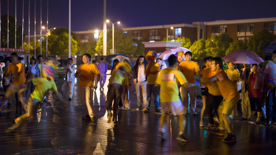 當(dāng)最后一名夜跑者回到主場(chǎng)地時(shí),天公不作美地下起了雨,而且雨量還不小,但是所有在場(chǎng)人員都選擇了堅(jiān)持,大家冒雨進(jìn)行了兩輪激烈的“撕名牌”大戰(zhàn),僅管因?yàn)橄掠陥?chǎng)地濕猾,大家的熱情與活力卻迸發(fā)得更加熱烈,經(jīng)過(guò)三輪角逐,星星家電代表隊(duì)摘得本次名牌大戰(zhàn)的桂冠,在主持人宣布這一消息之時(shí),家電全體在場(chǎng)人員在雨中雀躍歡呼,參賽隊(duì)員更是揮動(dòng)著手中的“彩虹頭套”互擁互抱,場(chǎng)面極其壯觀!